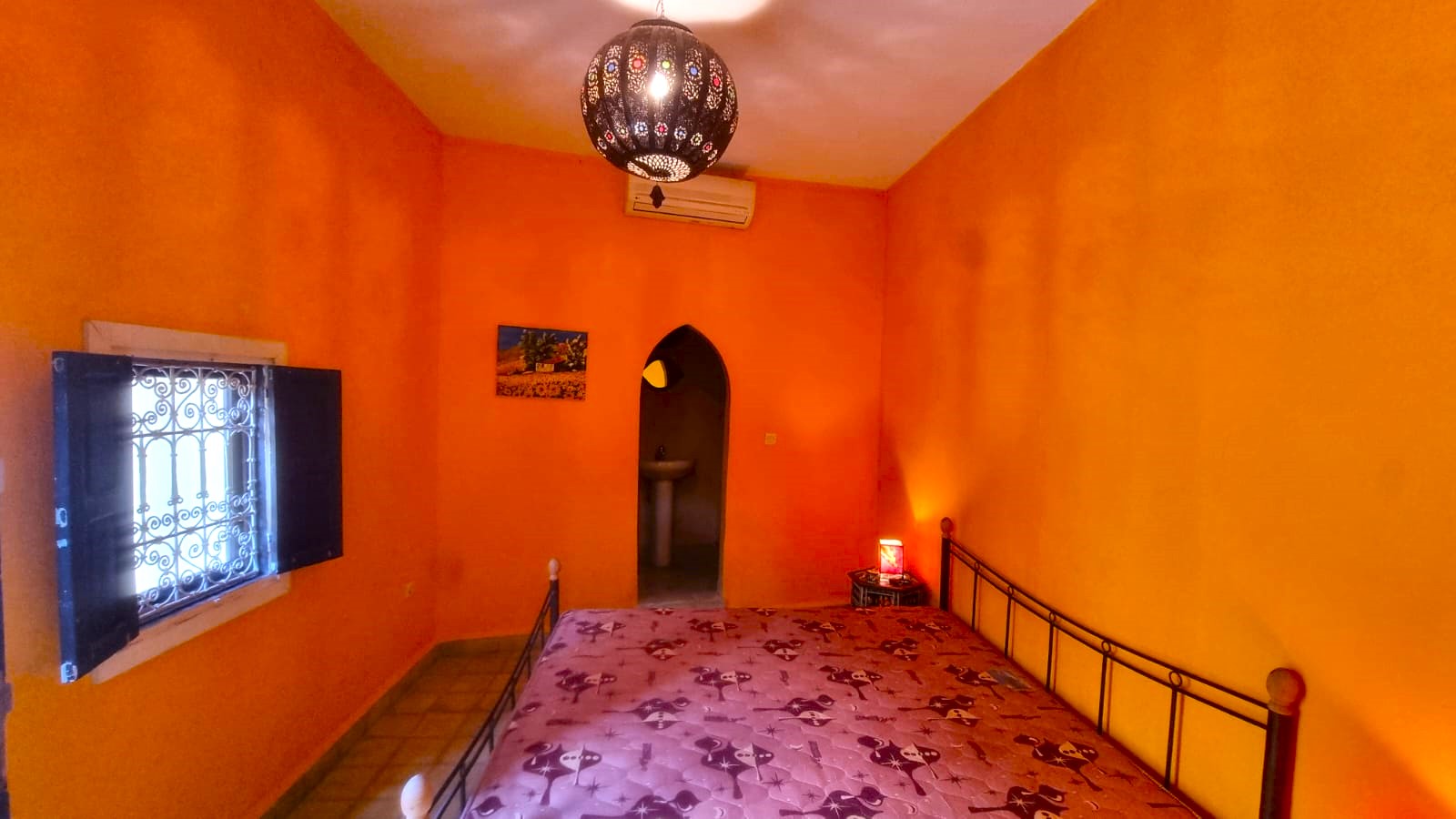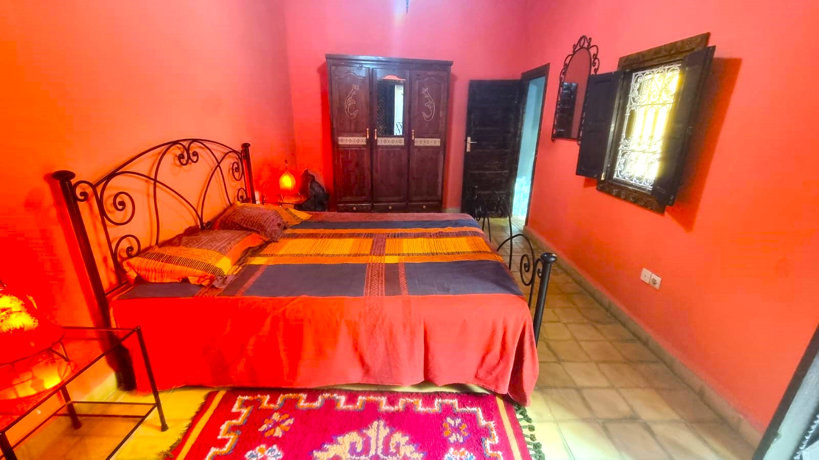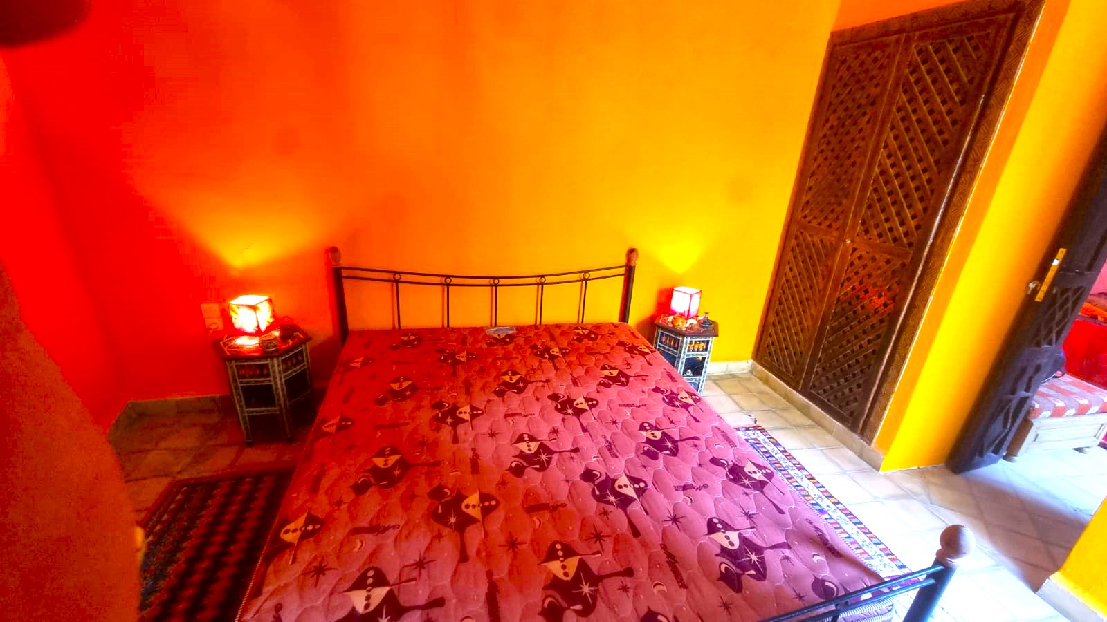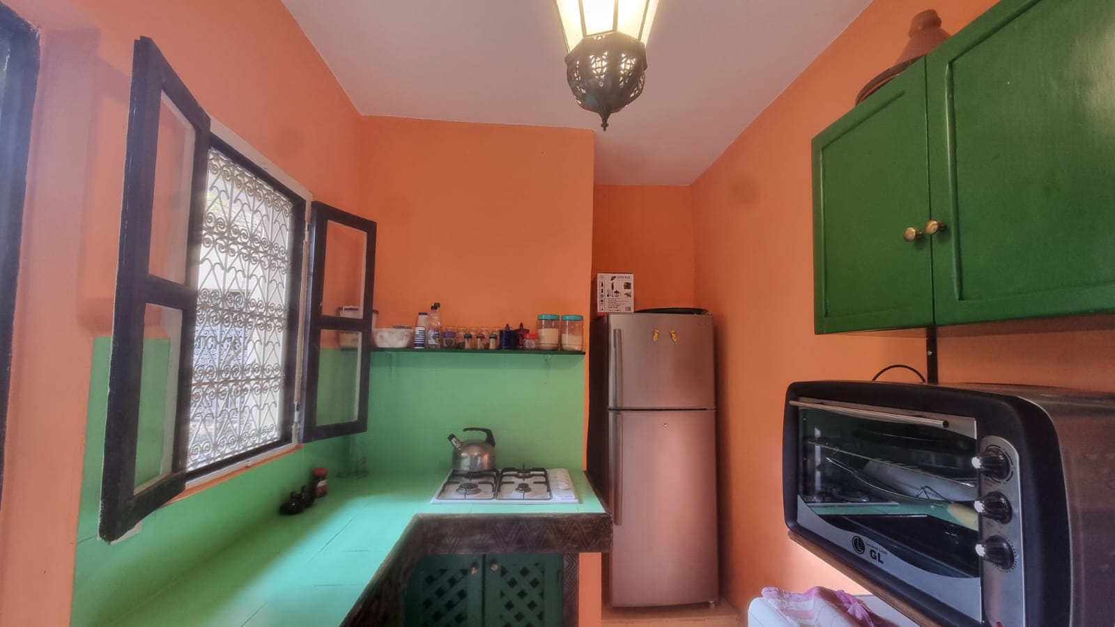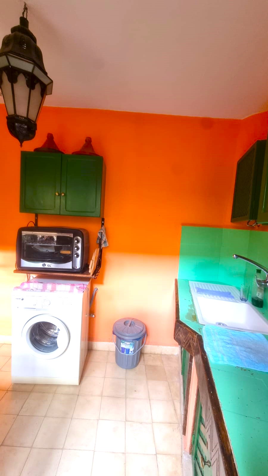 Édifié sur un rez-de-chaussée avec terrasse, ce bien séduisant propose de très belles prestations. Le rez-de-chaussée accueille deux chambres climatisées, chacune disposant de sa propre salle de bain privative, offrant confort et intimité. Le salon, harmonieusement aménagé dans un style marocain et européen, est sublimé par une magnifique cheminée traditionnelle en tadelakt, créant un espace de vie convivial et élégant.