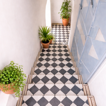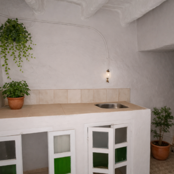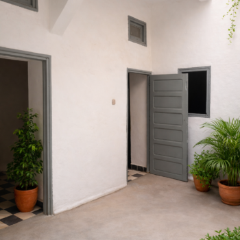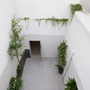 Au rez-de-chaussée, le Riad comprend 2 chambres, un salon, une cuisine, une salle de bain ainsi qu’une jolie cour intérieure décorée de zellige Beldi, véritable cœur de la maison et espace de vie typiquement marocain.
