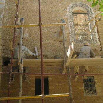 Le pisé Une technique millénaire déjà connu des Phéniciens. Le pisé fait intégralement partie du paysage architectural du Maroc. Apparemment rudimentaire, le pisé est en réalité très élaboré. Il consiste à construire les maisons avec de la terre, sans la soutenir par aucune pièce de bois (colonnes ou piliers) et sans la mélanger de paille, ni de bourre. Pour cela on banche, c’est à dire que l’on bat par couches successives, dans un coffrage de planches, de la terre préparée à cet effet. Ainsi battue, elle se lie, prend de la consistance, et forme une masse homogène qui peut être élevée à toutes les hauteurs données pour les habitations. L’habitat ainsi construit isole du froid et des grosses chaleurs. Les enceintes fortifiés (KSOURS) comme celle de Marrakech sont percées de trous, qui sont la trace des coffrages dans lesquels on coulait l’argile mêlée de paille qui la consolidait. On peut encore voir des murs de clôtures construits en pisé.