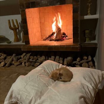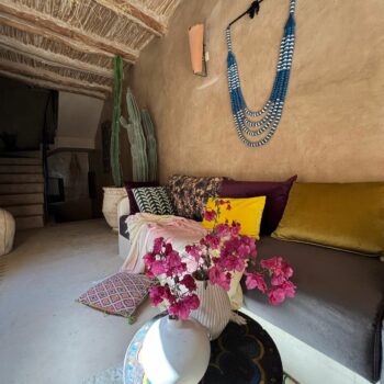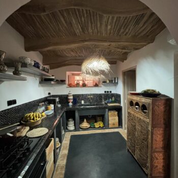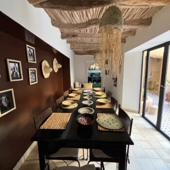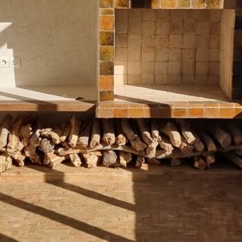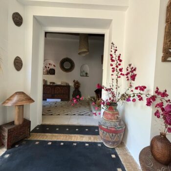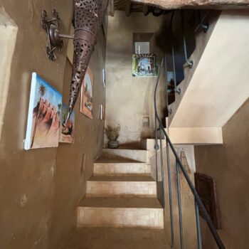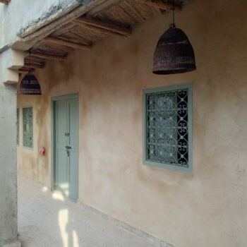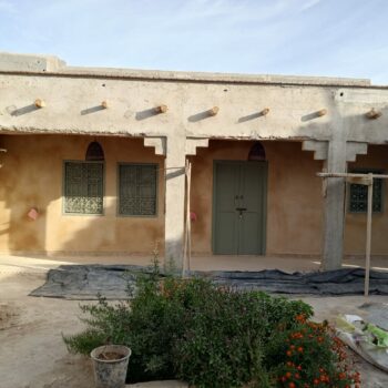 C’est une maison ancrée dans la terre de la plaine du Souss, née de cette terre, construite avec cette terre. Une maison construite pour y être heureuse. Les tortues, les chats, les lapins y sont heureux et nous aussi… Nous l’avons patiemment attendue (plus d’une année) mais le résultat en vaut largement le prix de cette patience. Il y a bien eu quelques turbulences dans nos rapports avec l’entrepreneur, quelques mises au point faire, mais n’en est-il pas ainsi dans tous les chantiers, de tous les pays? Tout cela est vite oublié et il nous reste que le bonheur de vivre dans cette si belle maison. Cette patience nous a appris mesurer le temps la façon du Sud marocain, sentir les choses autrement, nous rapprocher de la respiration de cette campagne, apprécier le chant du coq, le braiement de l’âne, le caquètement des poules, le bêlement des moutons, le miaulement des chats. C’est que les fermes nous entourent. Et, la nuit tombée l’air profond et modulé du muezzin qui chante depuis le minaret lointain. Voil pour le décor… Aissa, l’entrepreneur, a bâti une belle maison, une vraie demeure. Vaste, accueillante aux proportions idéales, pratique vivre et a entretenir. Son goût est sûr et nous n’avons jamais dù modifier quoi que ce soit. (En plus, et c’est important, le devis a été tenu au dirham près! – je doute que ce soit toujours le cas en Europe…) Otman, le menuisier ébéniste a réalisé un travail parfait. Portes et fenêtres, armoires, bureaux, tables, tout est irréprochable. Il faut voir la porte d’entrée. Somptueuse, une véritable œuvre digne de figurer dans un musée. Aïssa a chapeauté le tout en véritable diplomate, professionnel et efficace.